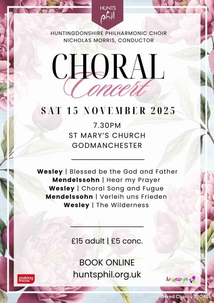 The Huntingdonshire Philharmonic Choir presents a programme of radiant 20th-century choral music. Vaughan Williams’s O Clap Your Hands bursts with jubilation, while his Te Deum in G combines grandeur with warmth and lyricism.