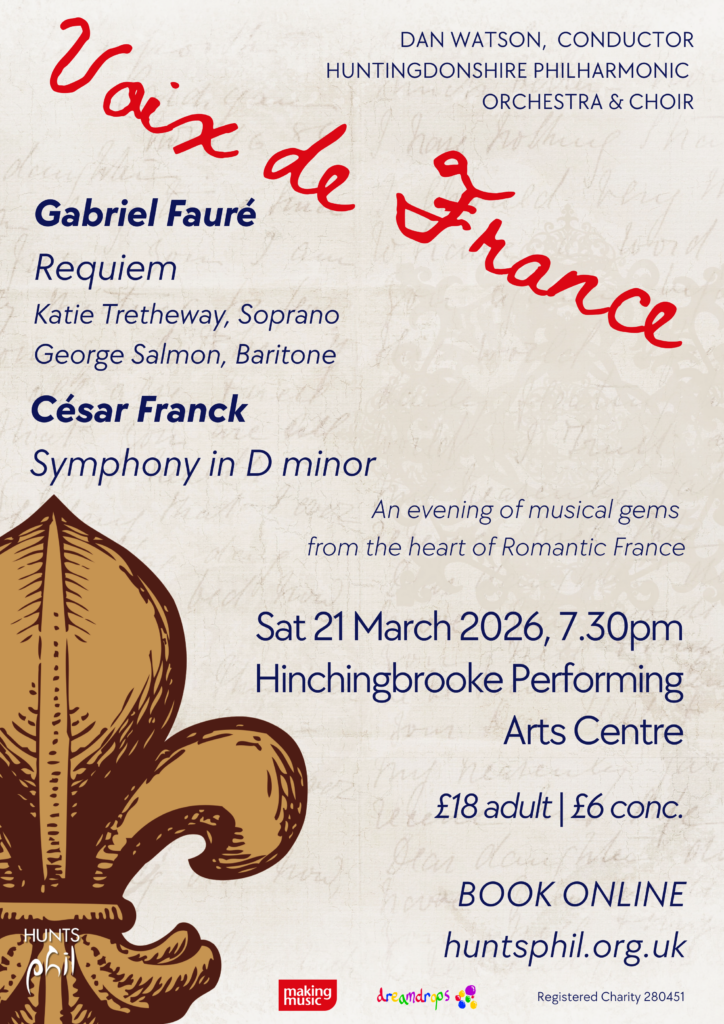 This March, the Huntingdonshire Philharmonic Orchestra & Choir present a French-themed programme of two masterworks. Fauré’s Requiem is unlike any other setting of the mass for the dead: gentle, luminous, and filled with a sense of peace; this is music for comfort. The choir is joined by a soprano soloist (Katie Tretheway) and a baritone soloist (George Salmon).